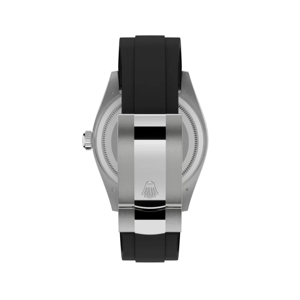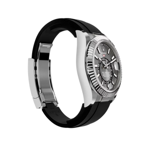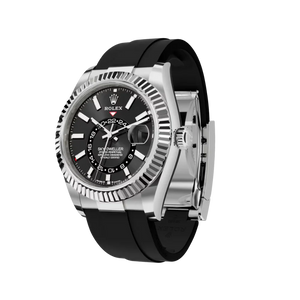 The RL Sky-Dweller M336239-0002 blends luxury and functionality with a 42 mm white gold case, fluted bezel, and bright black dial. Designed for travelers, it features dual time zones, an annual calendar, and RL’s signature Ring Command bezel for intuitive control.